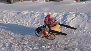 Un bambino su una slitta alimentata da soffiatori di fogliame
