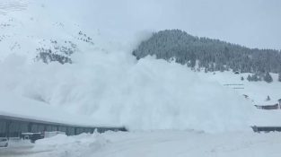 Nella città di Davos, in Svizzera, un uomo coglie una grande valanga si avvicina alla, mentre in una macchina spazzaneve.