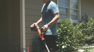 Un uomo parcheggiata di fronte a una casa, fuori dalla sua auto e subito ottiene un grande ombrello portato via da un forte vento. La tempistica è perfetta!