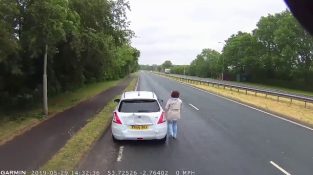 Un automobilista taglia la strada a un camion per prendere l'uscita dell'autostrada