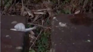 Una lumaca allunga notevolmente il corpo per attraversare uno spazio tra due pezzi di legno, che appare a prima vista molto grande per piccoli gasteropodi e coperture.