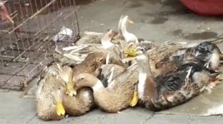Un anatra su una strada in Vietnam e suoni urlando come la risata di un uomo.