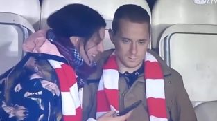 Un ventilatore è accompagnato dalla sua ragazza sugli spalti di uno stadio durante una partita di calcio. Stanco della costante di chatter, l'uomo sembra essere sull'orlo di una crisi di nervi.