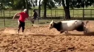 In una fattoria, un uomo evita l'attacco di un toro, ma un secondo toro arriva da dietro e sorpreso.