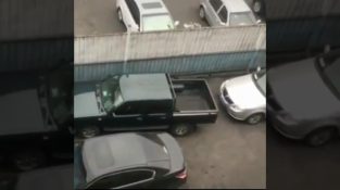 Un automobilista 'artista' esce da un parcheggio molto stretto dove viene bloccato da altre due auto.