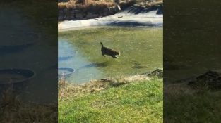 In un piccolo lago ghiacciato a Vilnius, in Lituania, un gatto cerca invano di catturare un pesce che si muove sotto la superficie ghiacciata.
