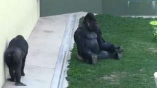 In uno Zoo, un giovane gorilla vuole giocare con suo padre. Si avvicina lentamente e insidiosamente da dietro per stuzzicarlo.