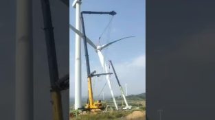 In un parco eolico in Cina, una gru crolla mentre solleva le gigantesche pale di una turbina eolica.