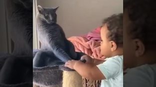 Un gatto si spaventa quando un bambino le si avvicina per giocare con lei.