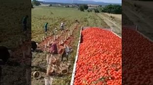 Un lavoratore in un campo di patate dolci svuota in modo impressionante i cestini del raccolto nella benna di un camion.