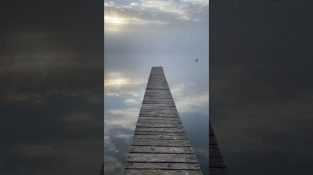 In Polonia, una donna e il suo cane seguono una passerella di legno per salire verso il cielo... Questa è un'illusione ottica su un molo e i riflessi del cielo nuvoloso sulla superficie del lago.