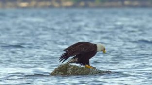 Un'aquila cattura un granchio nel becco mentre cerca di mangiarlo. Ma il granchio resisterà e fuggirà, salendo sulla testa dell'aquila.