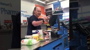Alla cassa di un supermercato Wal Mart negli Stati Uniti, un dipendente lavora a un ritmo irritantemente lento.