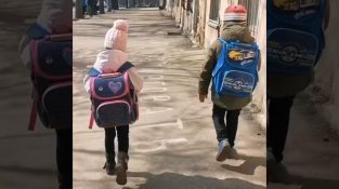 Andare a scuola, una bambina si accuccia per abbottonarsi lo stivale. Ma il peso della sua borsa la trascinerà in uno spettacolare tumulo.