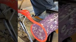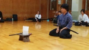 In Giappone, un uomo dimostra la nitidezza di una spada katana tagliando a metà un foglio di carta.