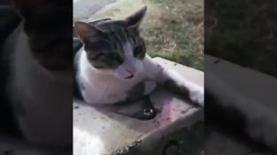 Un uomo aiuta un gatto molto assetato che stava cercando di bere l'acqua da un rubinetto.
