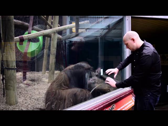 イギリスのコルチェスター動物園で, ラジは、オランウータンは、カード紙の魔術師とのトリックを模倣しようとしています.