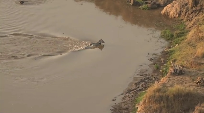 恐怖ゼブラが狭く大きなワニのジョーをエスケープ. 残念ながら、このため, 対岸に待っている空腹2匹の雌ライオン.