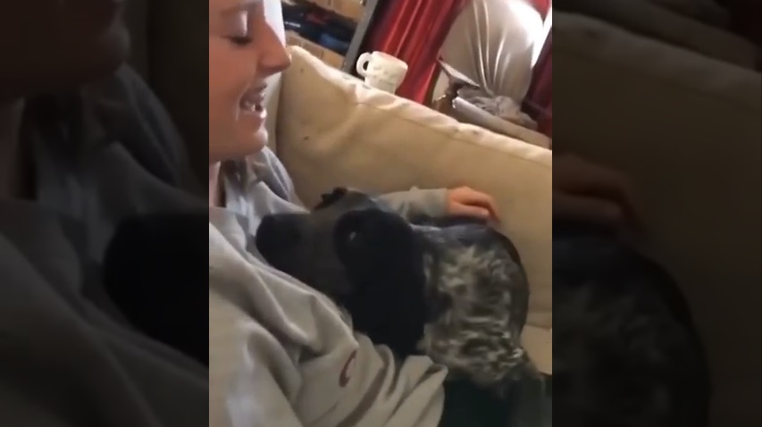 グラストンベリー、イングランドで, Kanzie, 血統書付きの犬スプリンガー, 彼はの所有者の抱擁を緩めないと言います. たび彼女はプッシュ, 磁石のような彼女の腕の中で犬の背中.