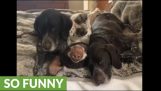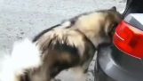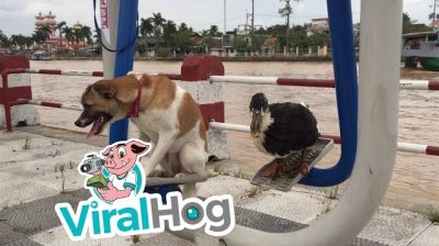 アヒルと犬は幼い頃から良い友達です, そして、彼らは一緒にどこへ行きます, 場合でも、彼らが行使, 彼らは一緒に働きます.