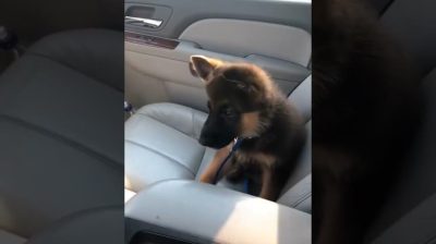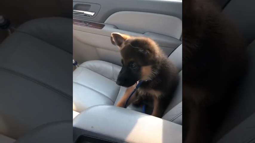 車に乗った子犬がバハ・メンの「フー・レット・ザ・ドッグス・アウト」のコーラスに合わせて吠える.