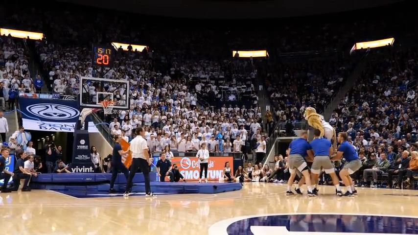 コスモクーガー, ユタ州、米国の大学でのブリガム・ヤングのマスコット, 5人の選手の助けを借りて、3点のラインからの壮大なダンクを作ります.