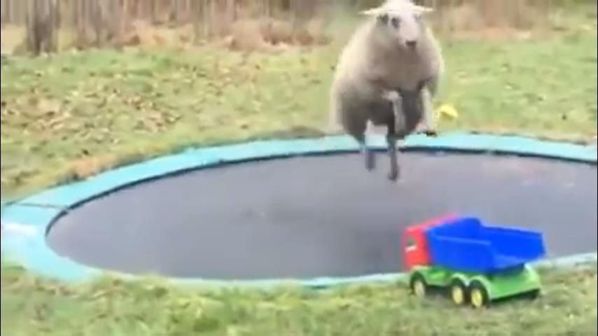 羊はトランポリンでジャンプするのが楽しい, 家の庭で.