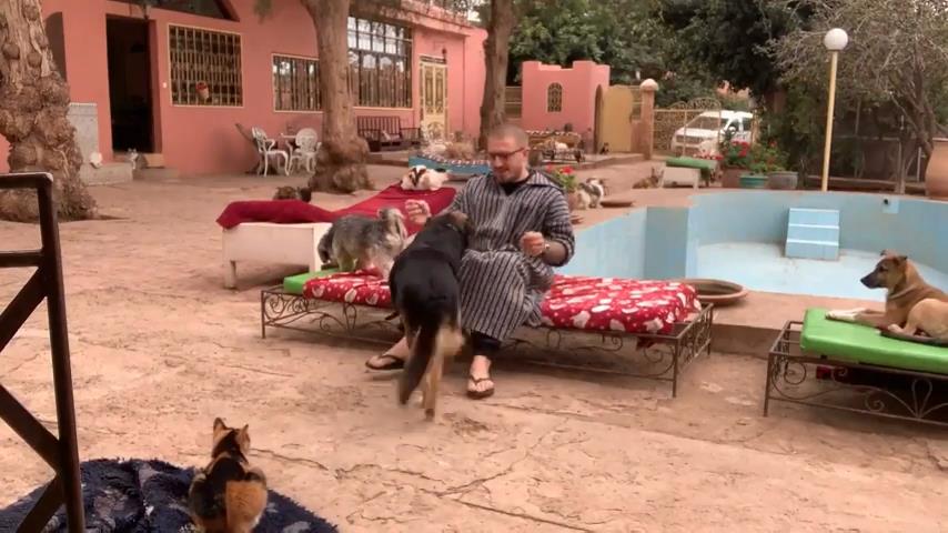 モロッコ、アガディール市のサンシャイン動物保護区で, 男は建物のオープンスペースの周りの小さなベッドの1つにしばらく座っています. 男はすぐに避難所にいた犬や猫からの抱擁で砲撃されます.