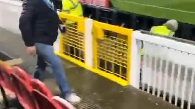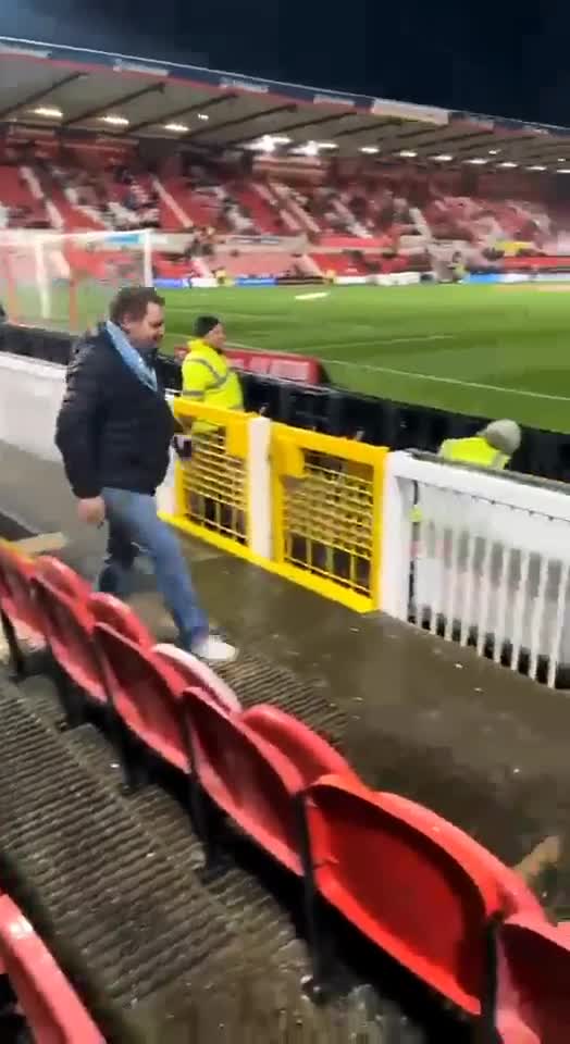 男がスタジアムのサッカー場の端に「プレス」ベストを着ているのを見たとき. 彼はその人に近づき、「プレス」ベストを押します.