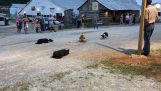 三つの牧羊犬は、円の中にアヒルをリード