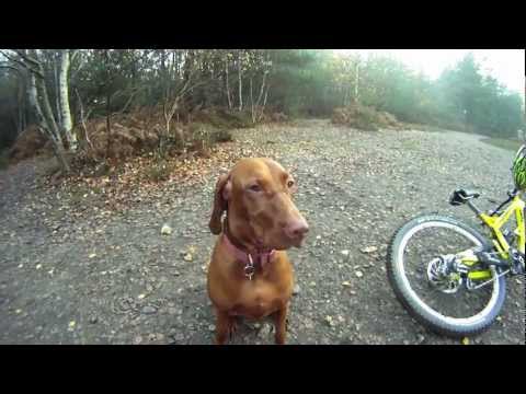 彼の犬の Swinley 森林、イングランドのこはく色と一緒に自転車に乗る山をやって James.