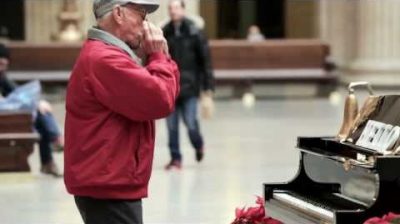 シカゴのユニオン駅に設置され、リモート コントロールによって制御されるピアノ. 正面スタンドまたは彼のそばに渡す人の動きに合わせて反応します。, 非常にお祝いとうれしそうな雰囲気を作成します.