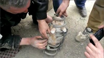 ロシアで, いくつかの男性は小さな子猫トヨタ ランド クルーザーの懸濁液の春の中に閉じ込めを支援しようとしています。. 後車ジャックと行っているし、春を削除, リリース管理.