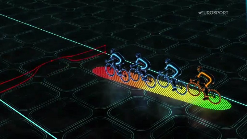チームの助けを借りてスプリンターが最後の場所にとどまる限りできるだけの空気抵抗を減らすために先にしようとしている他の人と. 最初は、エネルギーの100%を消費しますとき, 第四は、唯一の62%を消費します. 理想的には、スプリンターは彼のために仕事をするために最初の3ヶ所で彼のチームメイトにあり. スプリンターは、試合に勝つためだけに、最後の300メートルにすべての彼のエネルギーを費やしています.