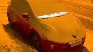Ο Nikita Merkushin (@noizebro) 3Dプロジェクターを使って雪の車に投影. この車にはアニメ映画「カーズ」の目が付いていました.