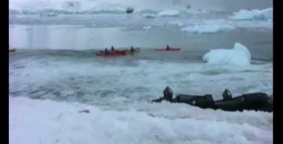 巨大な波はカヤックや南極のペンギンを一掃します。, 氷山の一部が崩壊し、海に落ちるとき. 命がけで走るペンギンたちのすべては金だ…