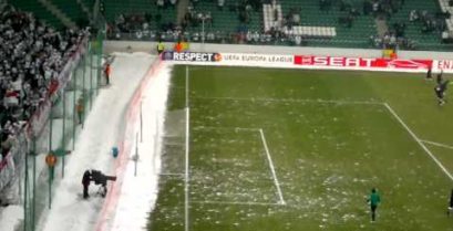 レギア ワルシャワ ファン ヨーロッ パリーグの 2 つのチームの試合の前に雪玉を持つスポーツ リスボンの選手を歓迎します。.