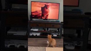 テレビ画面に向けて実行されているピューマを見て, 猫は離れて怖がって実行されます.