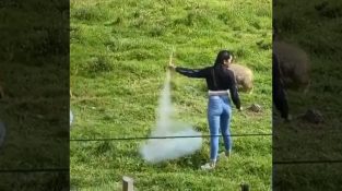 女の子は花火・ロケットをスローするようにしようとしたいです, しかし、彼女は最も重要なことを忘れていました - それを手から離すこと.