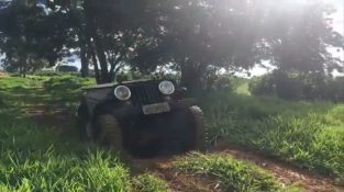 困難な上り坂を印象的に登る 4WD ジープ, その後、より印象的な水の深い水たまりに落ちる間.