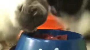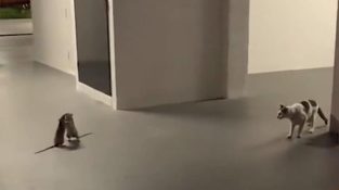 2匹のネズミが駐車場で戦う, そして猫は彼らがどう反応するかわからないのを見ます.