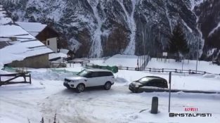 ランドローバーの運転手が雪に覆われた上り坂から車を切り離そうとすると, フィアットパンダは問題なく彼のそばを通り過ぎます.