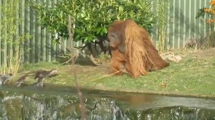 オランウータンは動物園の囲いの中にいる何人かのオッターに邪魔されました, それで彼は竹の棒を持って彼らを撃退しました. しかし, 頑固なオッターのギャングは反撃することに決めました.