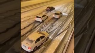 スペイン、マドリッドの高速道路の上り坂に数十台の車が停滞しています, 雪道を車輪が滑っている間、運転手は動かそうとします. エキサイティング.