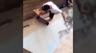 犬が若い男のスケートボードをつかむ, プールの端に残します.