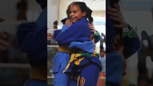 武道の戦いの後, 女の子は彼女の同じように良いパフォーマンスのために彼女の対戦相手を祝福します.