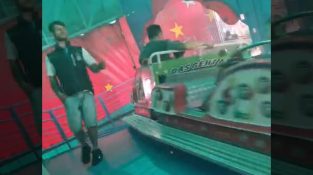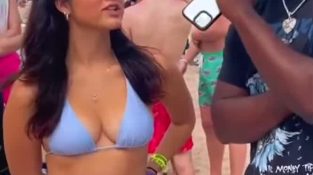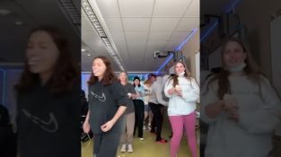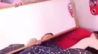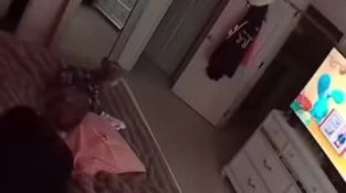 3人の女の子が目隠しをして、ボトル入り飲料水を避けなければならないゲームをプレイしています, シーリングファンにロープで結ばれています.