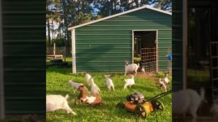 好奇心旺盛なヤギが芝刈り機に近づきます, しかし、農夫が機械を起動すると, ヤギは怖がって逃げる. 恐怖から「骨が折れて」地面に倒れる人もいます. これらのヤギ [...]
