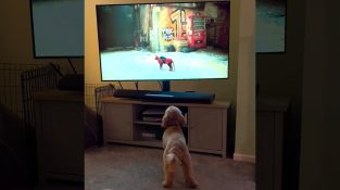 犬がテレビで猫を見ている, オーナーがプレイしているビデオゲーム「Stray」より. 猫が彼の方へ歩いてくるとき, 犬は怖がって逃げる.
