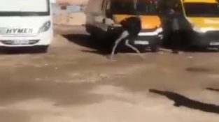 メクネス, モロッコ. アラブ人女性が非常に攻撃的なダチョウに遭遇, 彼女はそれを手と手で扱いたかった, しかし彼女はダチョウを過小評価していた.